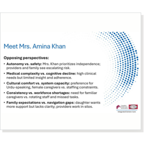 Dr. Kerry Bowman a souligné le besoin de trouver un équilibre entre autonomie, sécurité et risques en matière de soins en communauté, rappelant que les droits de l’individu doivent guider la prise de décision. Il a accentué la fluctuation de capacité, les perspectives culturelles et les besoins de communication, encourageant une évaluation transparente, un dialogue ouvert et des réponses collaboratives qui mettraient en valeur les préférences des client.e.s et la sécurité de l’équipe en cas de situations complexes. Olesya Kochetkova et Jean Johnston-McKitterick ont fait valoir la communication respectueuse, la documentation, l’implication familiale et le soutien coordonné.